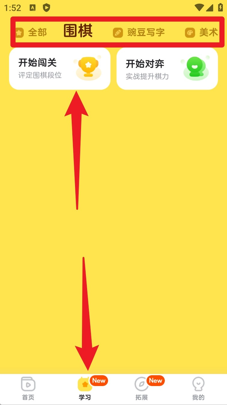 4. 点击底部“学习”页签,选择围棋模块开始闯关,按阶段提升策略思维能力。