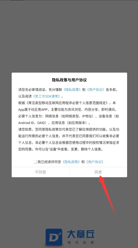 1. 初次使用大章丘时,需勾选同意用户协议与隐私条款,确认无误后点击“进入”按钮,才可继续后续操作。