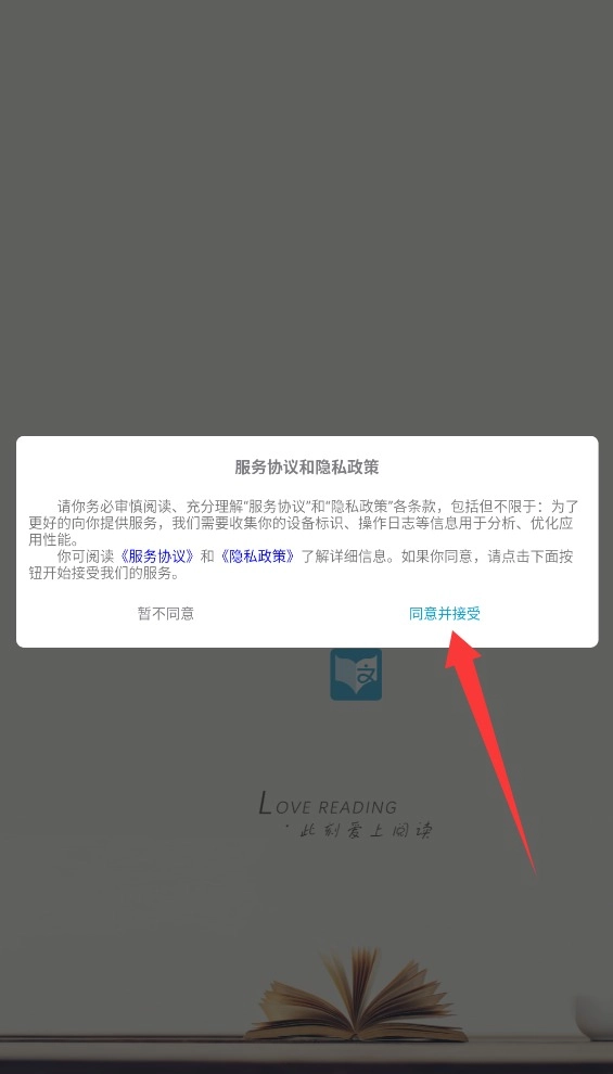 1. 当首次启动文徒小说,系统会弹出用户协议及隐私条款,阅读结束后点击“同意并接受”方可进入。