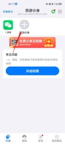1、于本站开启西游分身后,在首页点击“添加分身”。