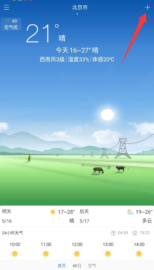 1、启动应用后进入天气主界面,点击屏幕右上角的"+"图标进入城市管理页面。