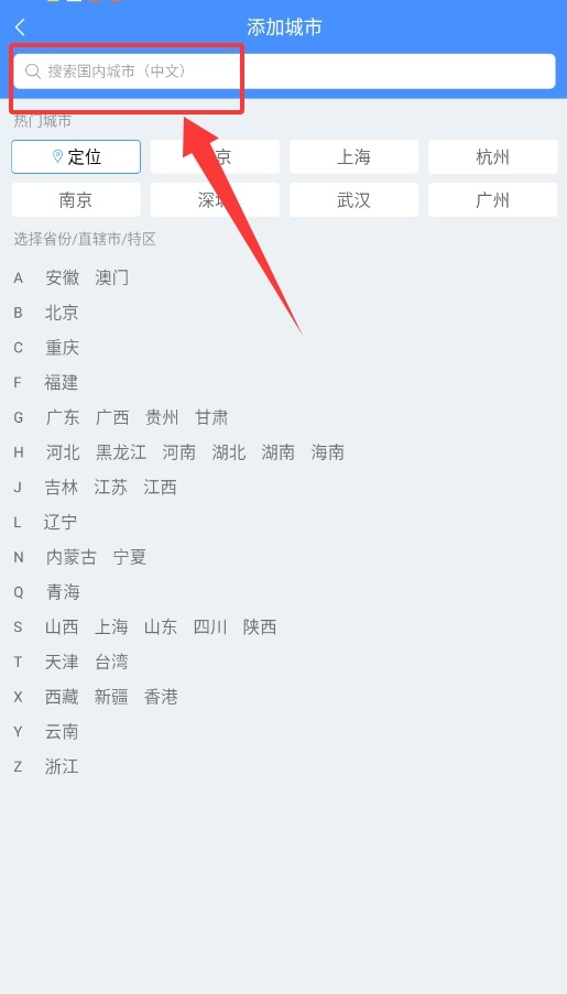 2、在搜索栏输入目标城市名称进行查找,或开启定位功能自动添加当前位置天气信息。