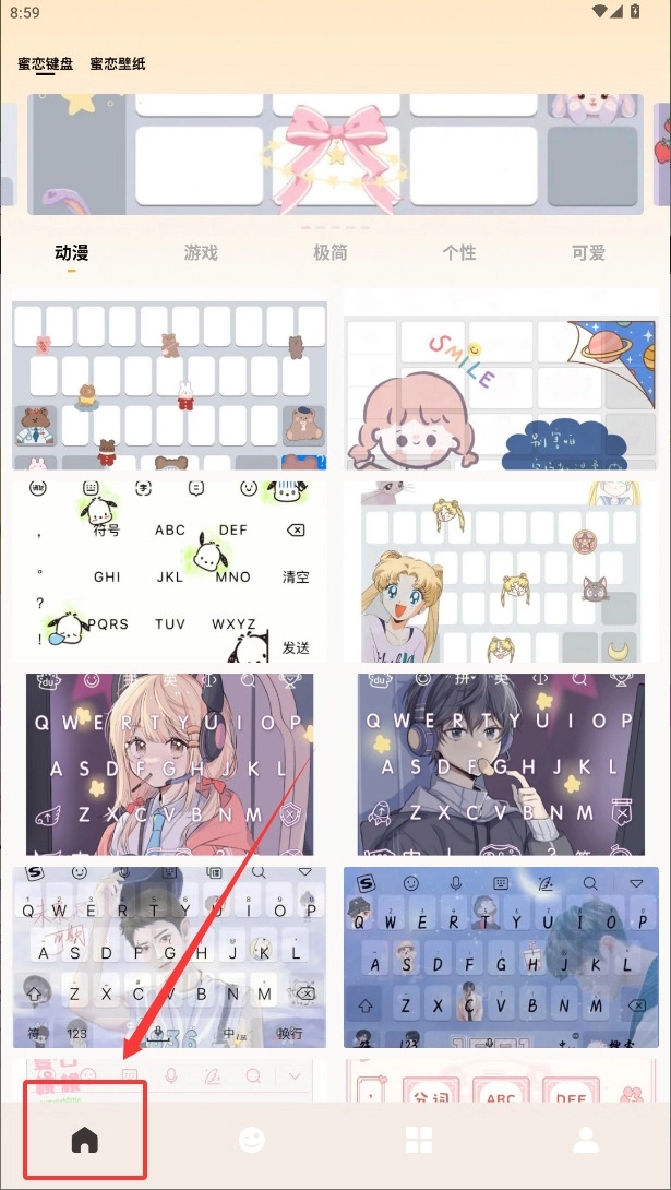 1. 打开应用,在左下角即可发现内容丰富的键盘主题库,其中涵盖多种风格样式,可自由选择并更换。