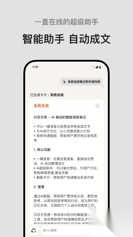 闪念贝壳,一款强大的智能笔记软件,专注于快速捕获灵感并智能整理内容,确保你的每一个想法都不会被错过。无论是打字录入、语音输入,亦或是随手涂鸦,闪念贝壳都能毫无压力地记录下来。而且,你所输入的内容会自动被整理成清晰明了的笔记,比如重新进行排版、添加恰当的标题与标签,无需你亲自花费时间分类,既省心又高效。不仅如此,闪念贝壳还能帮你提炼关键要点,剔除不必要的口语化表述,让内容呈现得更专业、更具条理。