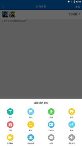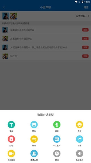 8、可选的对话类型有很多,比如文本、图片、语音、表情、红包、转账等等,模拟真实的聊天对话;
