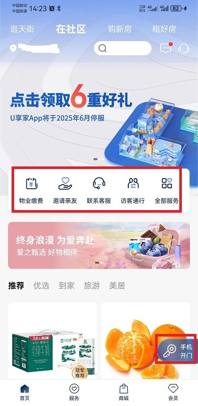 在首页,可以看到物业缴费、邀请亲友、访客通行、手机开门等多个功能!
