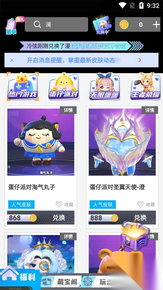 通知中心:推送新皮肤上线、任务更新、兑换成功/失败等消息。