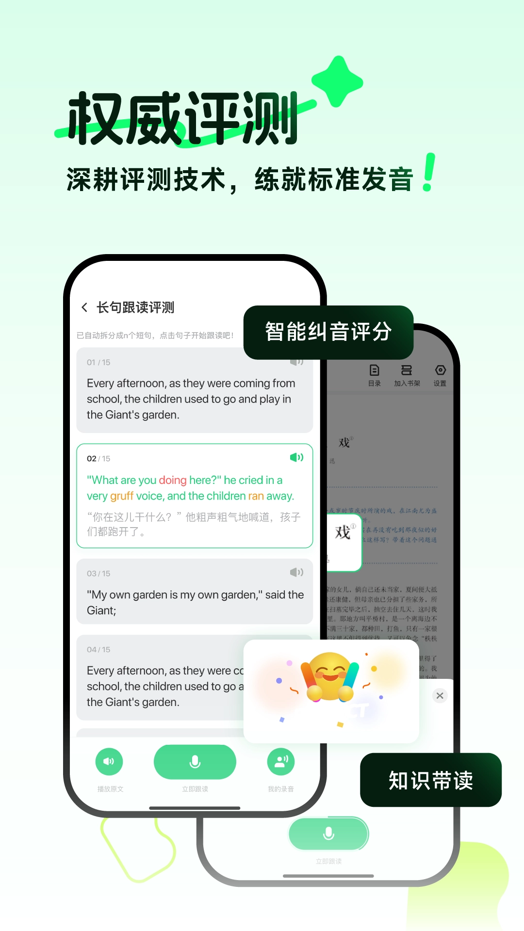 3.点击课本封面选择对应教材,单击句子或单词,系统自动播放标准发音,并实时评分
