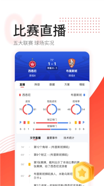 4、海量数据: 提供大量体育比赛数据信息,满足不同用户的联赛观看需求。