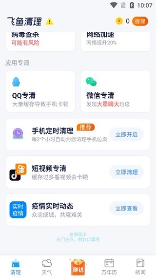 1、下载并安装飞鱼清理大师软件。待成功进入软件界面,便可看到诸如一键清理、一键加速之类的功能。