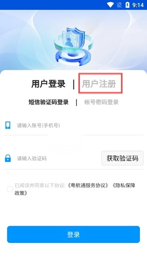请打开粤航通,于登录界面找到并点击用户注册功能。