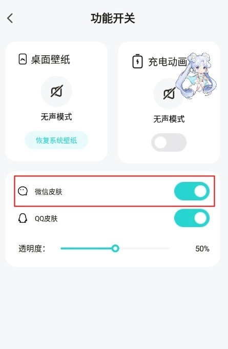 2、在功能开关界面,选开微信皮肤选项打开