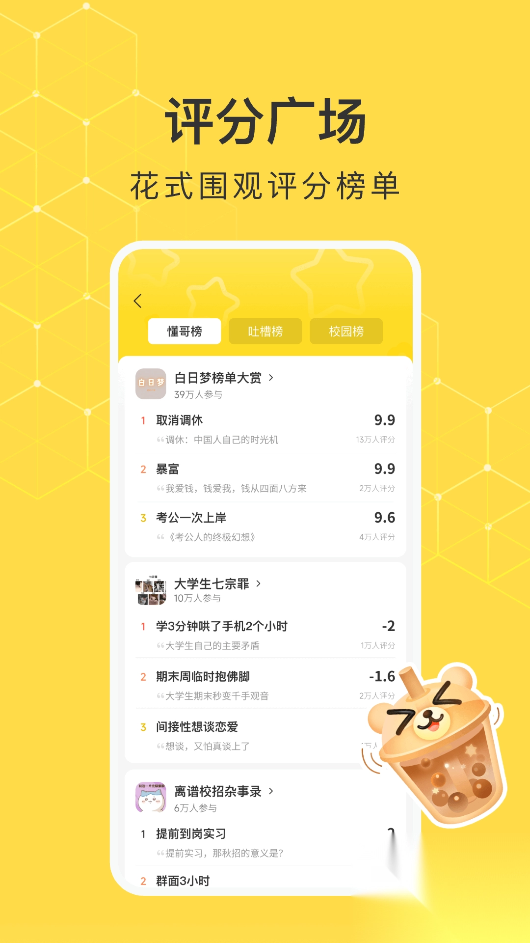 你可以创建话题、参与话题内容共建和对话题评分,而且还能花式围观懂哥榜、吐槽榜、校园榜等各种丰富、有趣的评分榜单!来网易小蜜蜂一起解锁更多玩法,和小蜜蜂们换个姿势讨论当下热点~