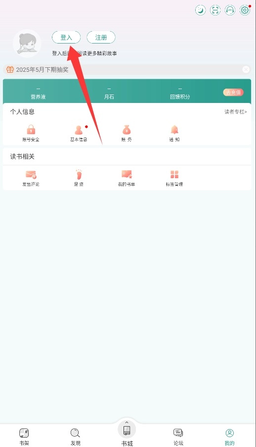 3、登录时可以用邮箱、笔名或手机号,新用户需要先注册账号才能登进去看书。