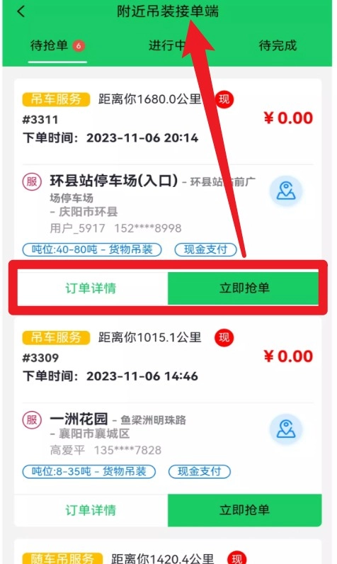 3、在吊装接单端可查看订单详情并点击“立即抢单”。