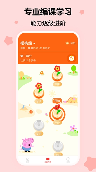 ●苹果级,包含《小猪佩奇》《字母方块小精灵》《数字积木》等重量级动画在内的百余部内容,通过趣味故事、拼读启蒙、分级阅读带领孩子实现英语进阶,让孩子对英语充满自信。