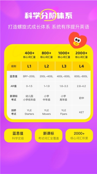 根据对儿童能力发展和内容的深刻理解,科学匹配不同级别内容,保证小朋友看到的动画片,匹配当前的年龄和英语水平。
