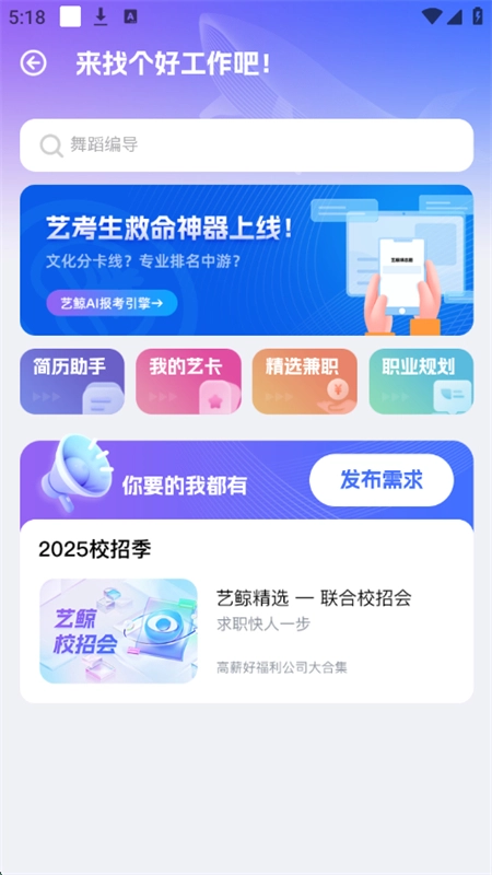 3、在AI就业匹配页面,可以发布你的需求,创建简历等,平台还可以根据您的需求为您制定职业规划。
