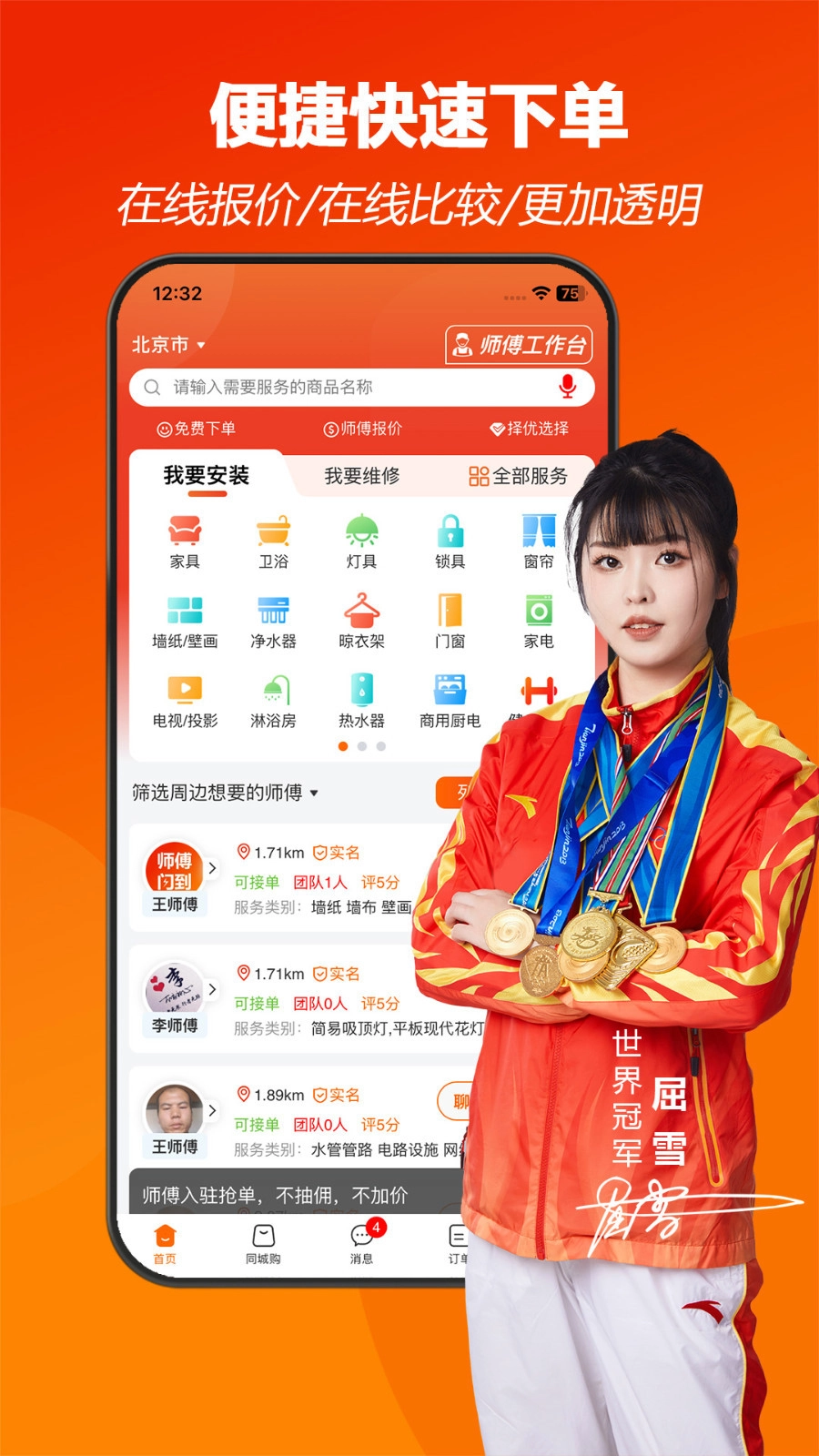 4、全新界面,提供最全面的家居服务,一键下单即将响应,用户可随时查看,师傅及时响应到位;