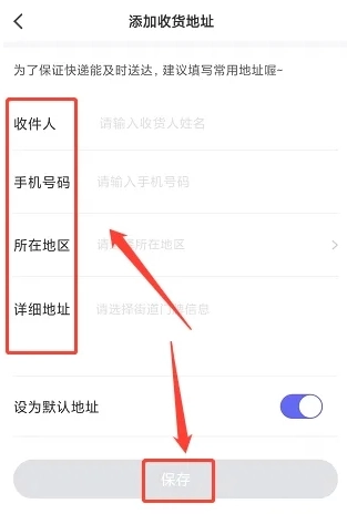 4、进入添加收货地址的页面,依次填写收件人姓名、手机号码、所在地区以及详细地址,随后点击【保存】按钮,完成新收货地址的添加。