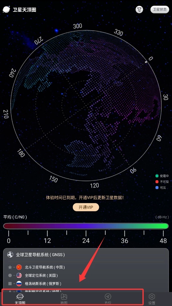 3、通过底部导航栏可切换不同功能模块,进入天顶图界面即可实时查看卫星分布状态与信号强度。