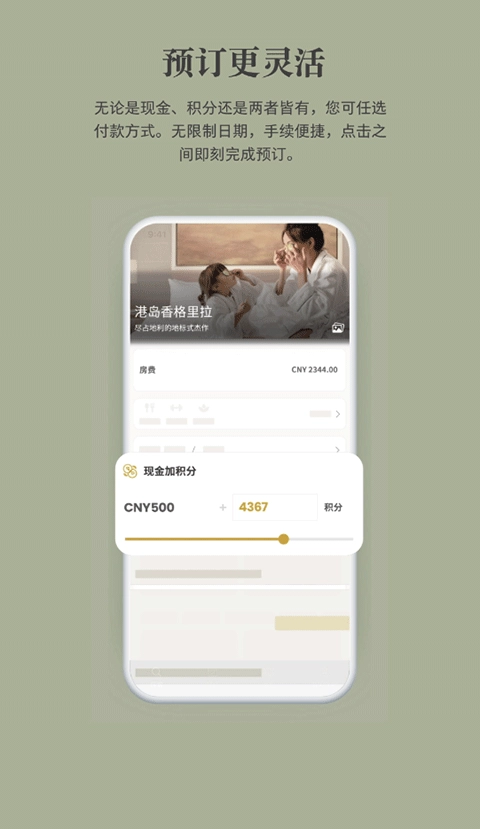 3、选择您心仪的支付方式。现金、积分或两者皆用。不设日期限制,摒弃繁琐拖沓的过程。仅需数次点击,尽享轻松入住。
