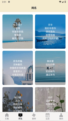 1、在“网名”板块,用户能够发现各式各样的创意昵称,助力他们于社交平台彰显个性。