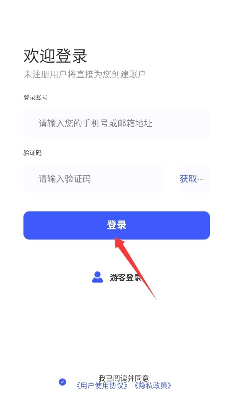 2、输入手机号或邮箱地址,获取并输入验证码,勾选同意协议后点击登录一键注册。