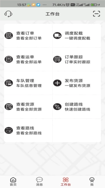 双智运以【首页】、【消息】、【工作台】、【我】这四大板块作为切入点,融合四大功能模块,实现掌上物流闭环。