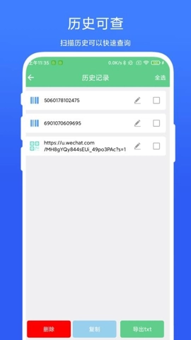 1、为了满足个性化使用需求还支持将历史扫码信息以TXT文件格式导出,通用扫一扫方便用户查看和分享。