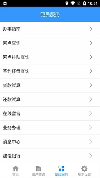3、而且这里还提供了许多便民服务,包含网点查询、网点排队查询、贷款计算、在线留言等等;