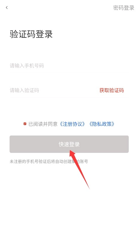 3、输入注册手机号和对应密码,勾选同意协议后点击"快速登录"按钮自动注册账号。