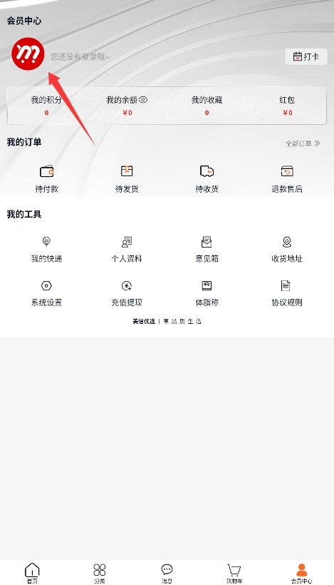 2、进入会员中心页面,点击个人头像区域即可跳转至账号注册与登录界面。