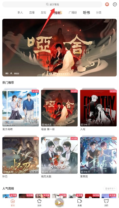 1. 当进入应用的首页后,既能够选择“听书”功能来浏览推荐的小说,也可以借助搜索栏去查找目标作品。