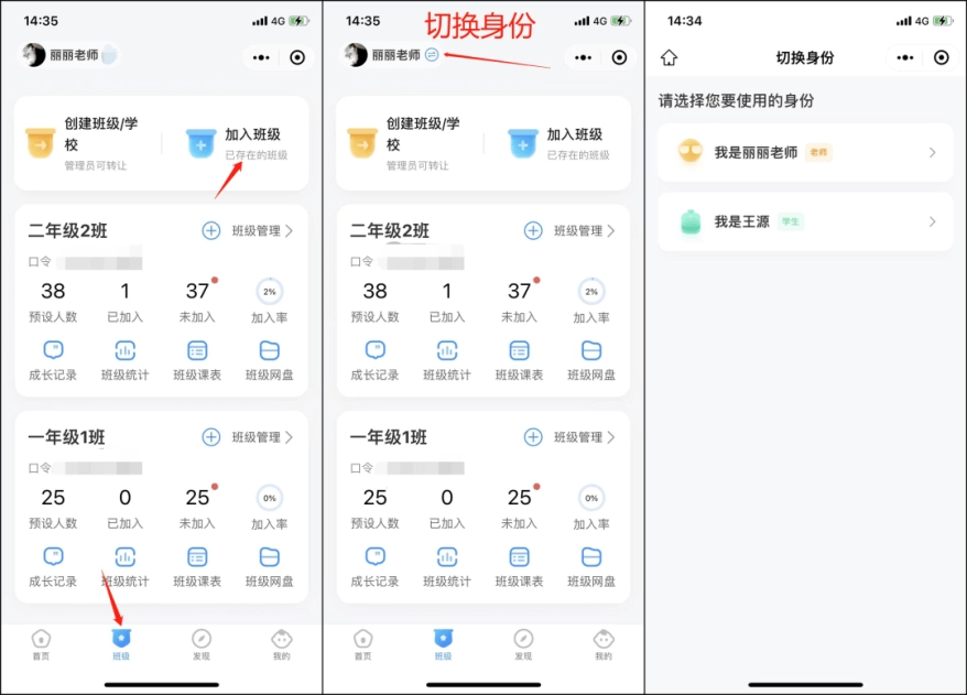 进入班级小管家-->班级-->加入班级-->班级口令/管理员手机号-->输入信息保存。加入之后可以切换身份,切换之后两者互不影响。