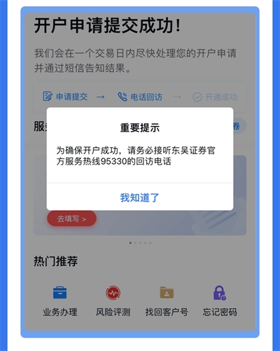 开户成功后提示客户可通过与客服联系获取开户确认单