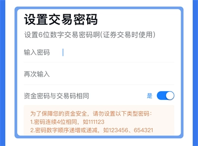 输入六位数字密码,可勾选资金密码跟交易密码相同,点击下一步