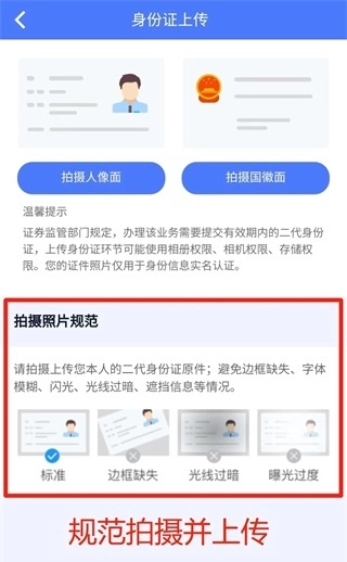 4、上传身份证人像面、国徽面,注意规范拍摄,不切边、不遮挡,字迹清晰