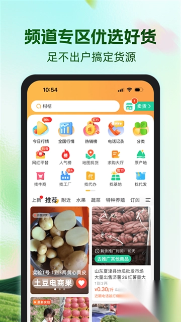 更真实的产地货源,实时查看产地动态视频,获取货源价格资讯;更快捷的产销对接,一键对接产地农户代办,帮你找到实惠的产地货源。