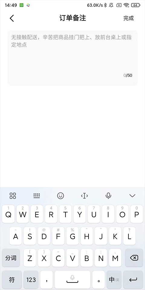 4、用户点击该选项后,就可以在备注框中输入您需要留下的信息,例如对食品的要求、特殊口味、配送地址等,备注完成点击“完成”即可完成备注。