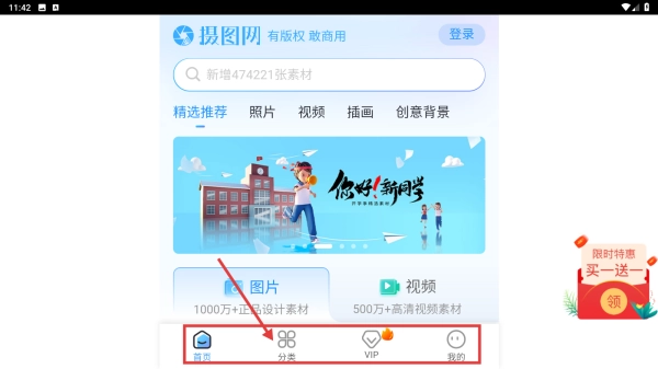 1. 打开摄图网,点击页面底部的分类选项,进入素材分类页面进行浏览。