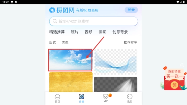 2、在分类页,选择目标素材如天空云朵背景图 ,进入素材详情页。
