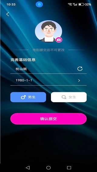 2、初次使用需要我们完善资料,可以添加你的昵称和生日、性别等信息。
