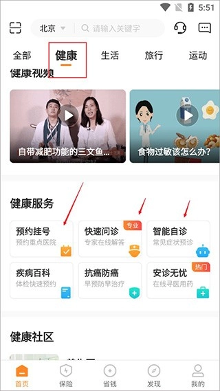 3、如果在生活中遇到一些健康上的问题,可以切换到健康这里。这里支持预约挂号、快速问诊、智能自诊、疾病百科查看等;