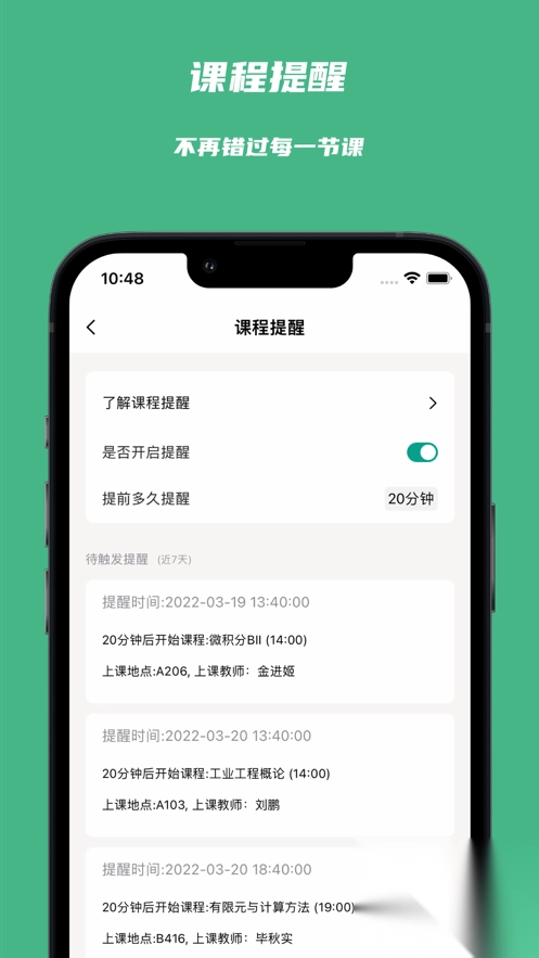 用户可自定义上课前提醒时间,通过通知栏或铃声提醒,避免错过每一堂课程。