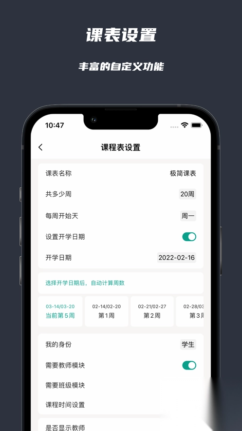 不仅如此,极简课表还十分贴心,提供了是否显示周末课程的选项,同时支持设定当前周次与学期总周数,方便用户精准把控学习进度。