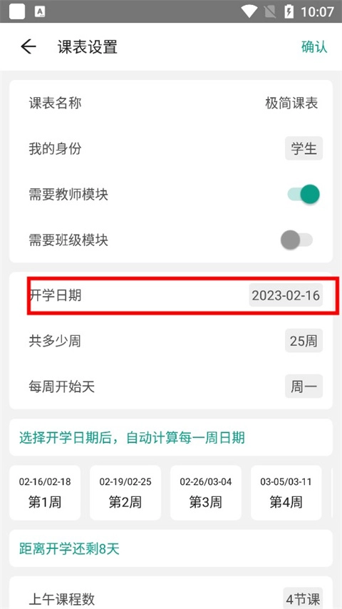 2、在设置页面中选择“开学日期”选项,选定具体时间后点击“确定”,系统将自动调整对应周次。