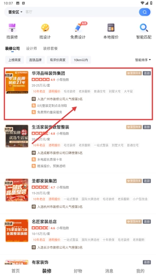 2、在装修页,选择感兴趣的装修公司如华浔品味装饰集团 ,进入品牌详情页。