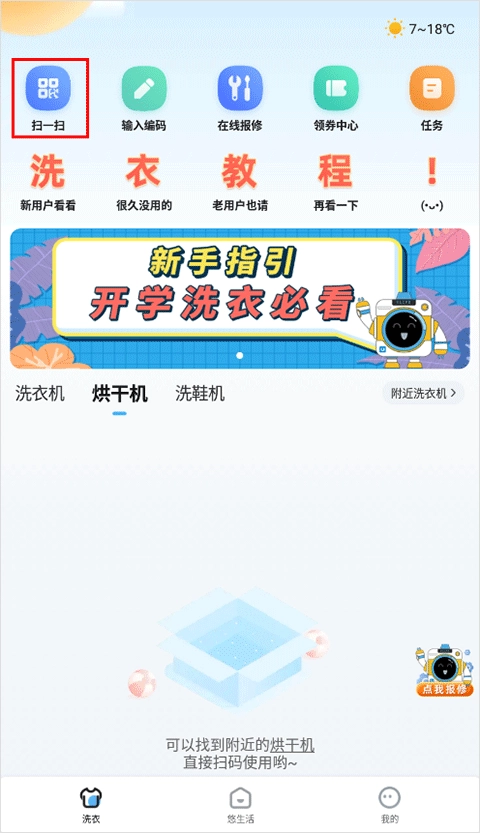2、登录之后点击洗衣功能,洗衣有两种方式,第一种就是扫码;