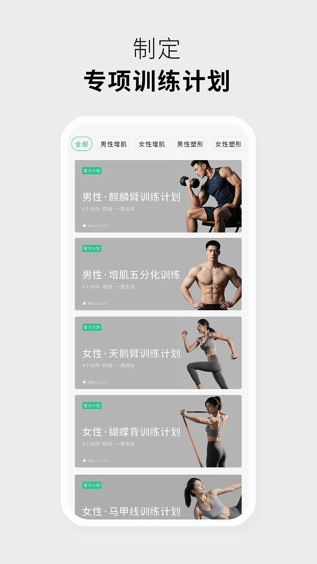 1、多种计划:拥有多种不同的训练计划,可以让用户使用,用户能够获取更适合自己的训练计划;